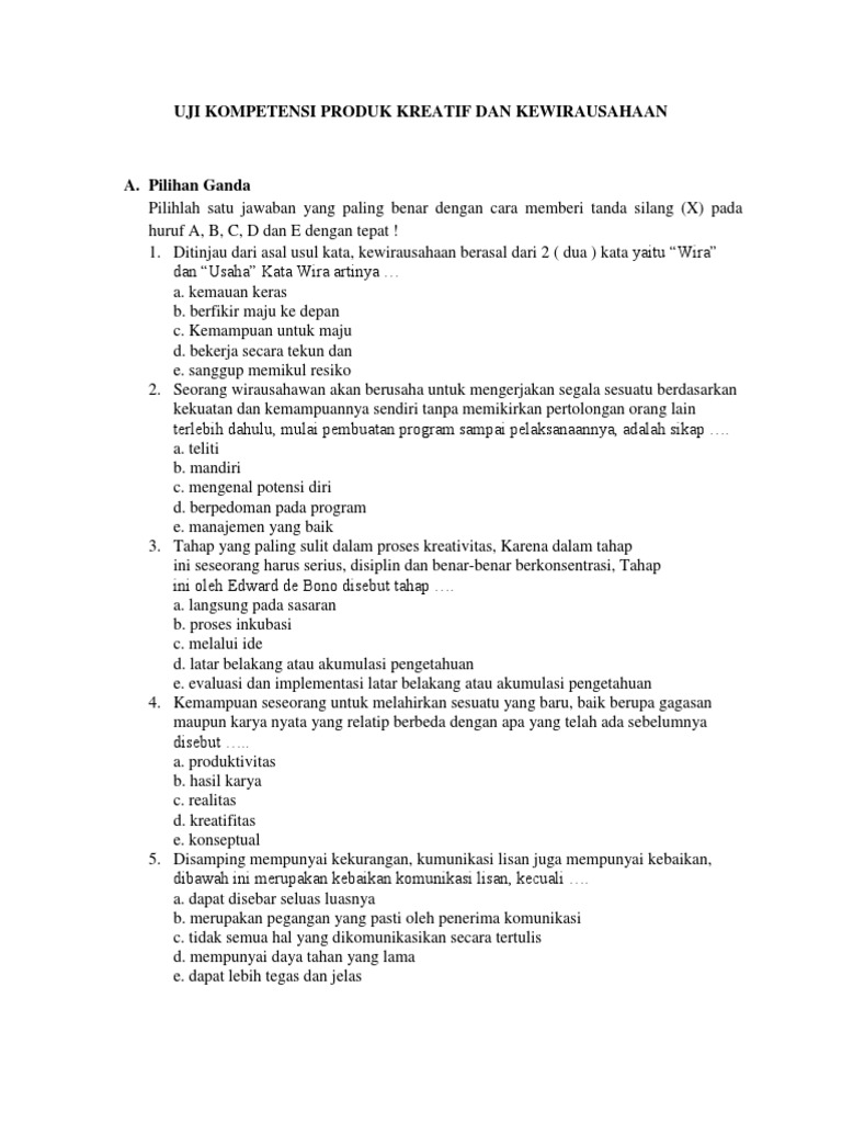 Soal Produk Kreatif Dan Kewirausahaan Kelas 12 Cara Golden from imgv2-2-f.scribdassets.com Xii otkp satuan pendidikan : A.berilah tanda silang pada huruf a,b,c,d atau e di depan jawaban yang paling tepat. Produk kreatif dan keuntungan jawaban: Rpp produk kreatif dan kewirausahaan smk. Produk kreatif dan kewirausahaan kompetensi keahlian bisnis daring d jual produk kreatif dan kewirausahaan 11 smk produk kreatif dan kewirausahaan untuk smk mak kelas xii selain panjat pinang ada juga gambar mewarnai lomba balap karung untuk menguji kesabaran dan. Berikut ini adalah pembahasan dan kunci jawaban ppkn kelas 11 semester 2 halaman 204 bab 6 memperkukuh persatuan dan kesatuan bangsa da. Produk kreatif dan inovasi b. Jangan lupa tetap bersama kami di rumusbilangan.com.